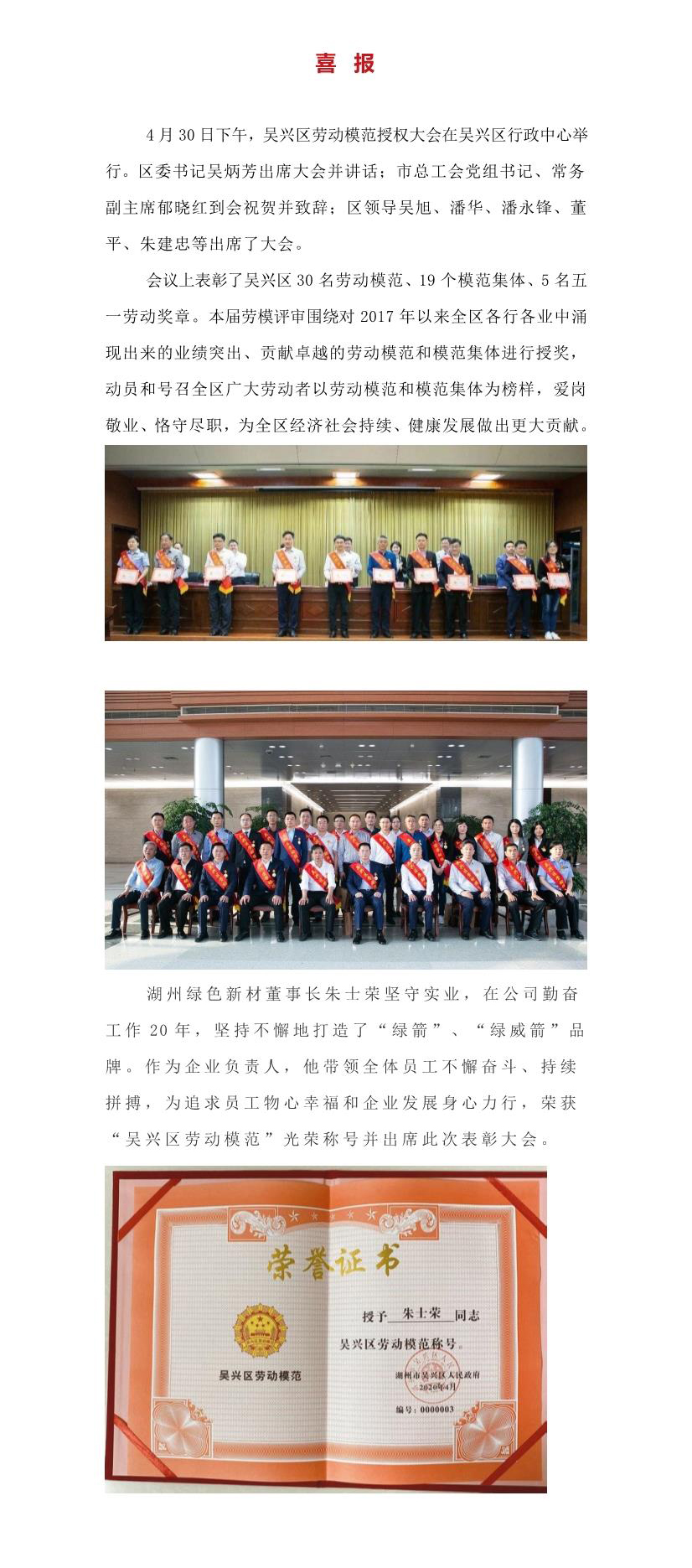 熱烈祝賀綠色新材董事長朱士榮榮獲“吳興區(qū)勞動(dòng)模范”榮譽(yù)稱號